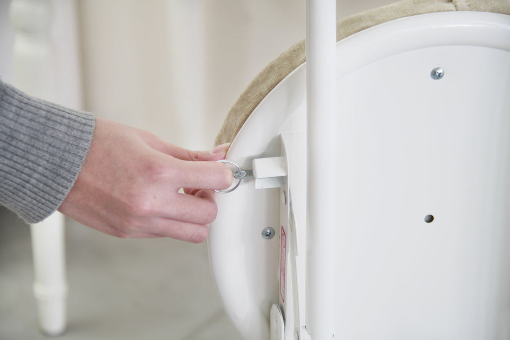 脚を広げた状態で上にあっても脚が閉じない、座面下にバネ式のロック付き。
