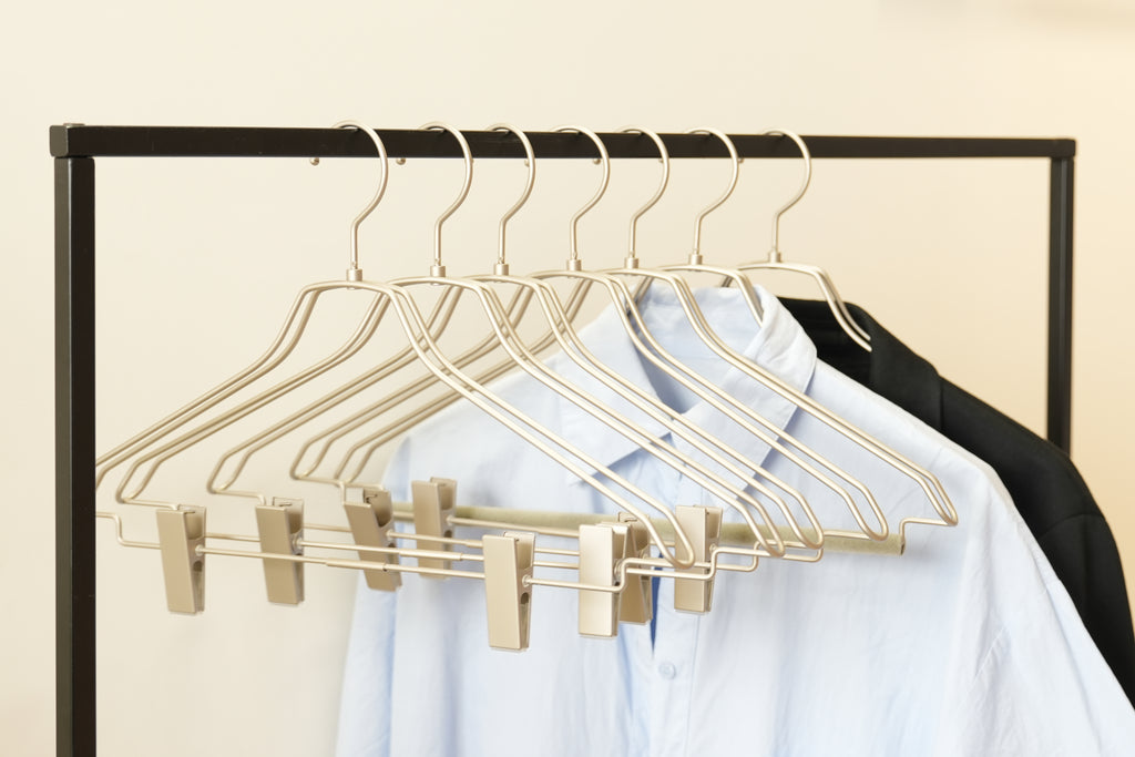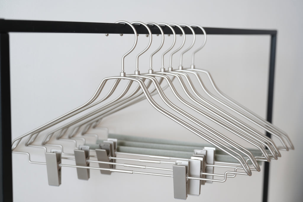 艶消しのシルバーカラーと、シンプルなフォルムで洗練された印象を放ち、クローゼット全体をすっきりエレガントに演出します。